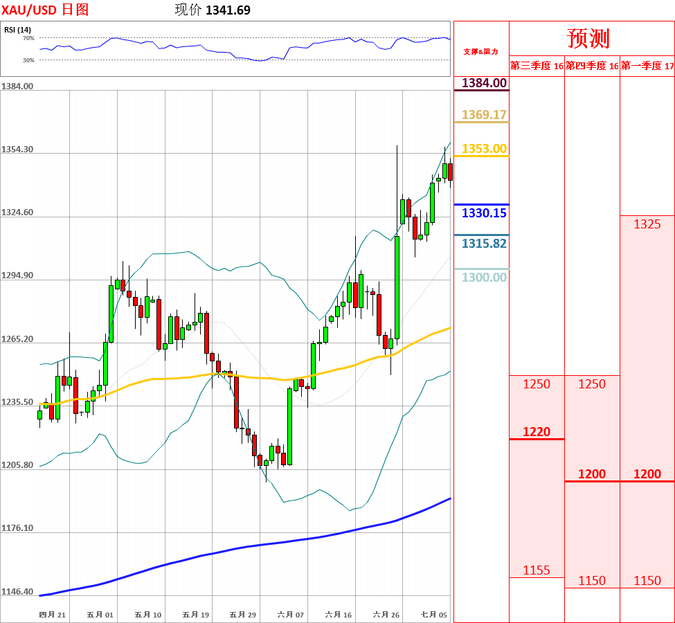 昨日,黄金涨至年内高点附近之后,小幅回调,收了带有上下影线的小阳线,短中长期均线呈多头排列,趋势总体偏多,但上方1358.23阻力较强。今日,如果向上突破1358.23,上方空间打开,接下来涨幅会加速;但如若在年内高点附近再次遇阻回落,黄金将下探至5日均线1334.50附近。此外,4小时动能指标超买之后,拐头向下,日线动能指标也开始超买。