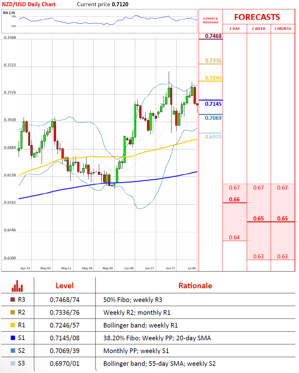 英国退欧引发的五连涨之后,纽元/美元周二从0.7233跌至0.7157。周三,汇价继续走低,12:00GMT时已经触及0.7109,意味着斐波线38.2%(0.7145)和周PP(0.7119)已经告破。而现在货币对所在的支撑区域则是由月PP和周S1组成的0.7069-0.7040。