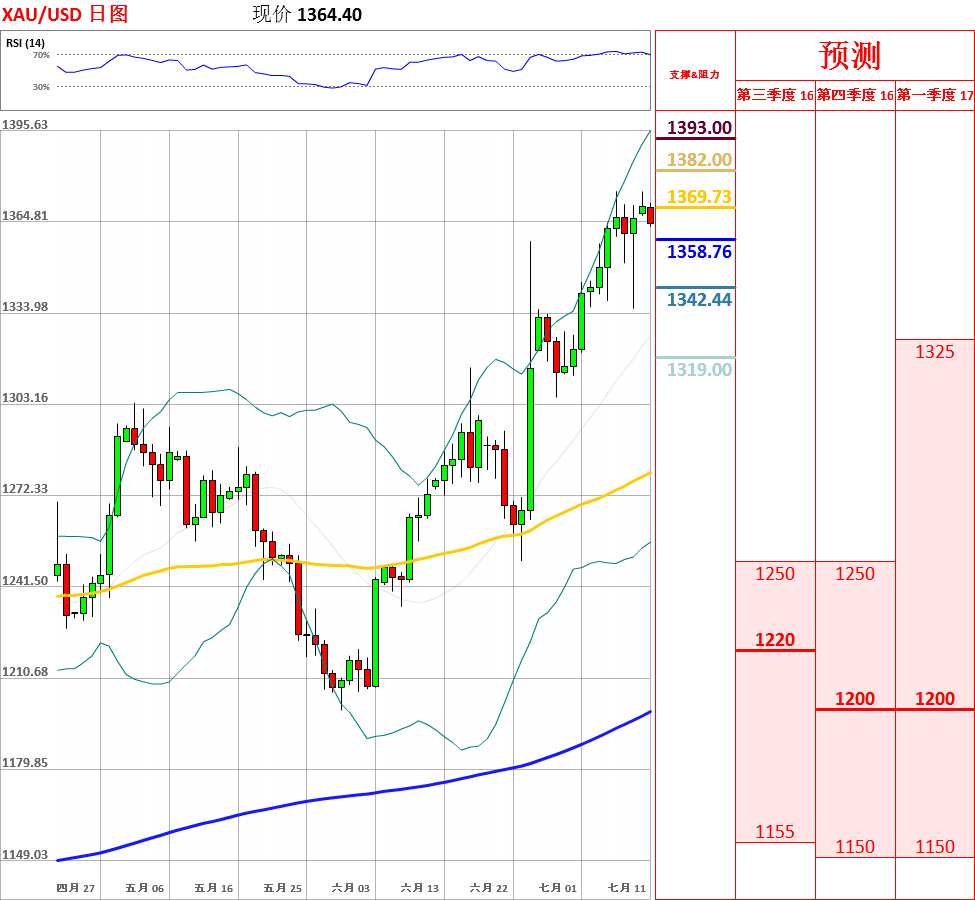 周五,黄金跌至1335.42之后,大幅反弹,收了带有长下影线的小阳线,周线收了中阳线,连续5周收阳,趋势总体偏多。今日,上方关注1375.08阻力位,下方关注1350支撑位。如果向上突破1375.08,金价将测试1390主要阻力位;但如若下破1350,黄金将再次测试1335主要支撑位。此外,日线MACD红柱变小,Stochastic、RSI、CCI超买,因此不排除回调的可能性。今日公布美国6月就业市场状况指数(LMCI)。