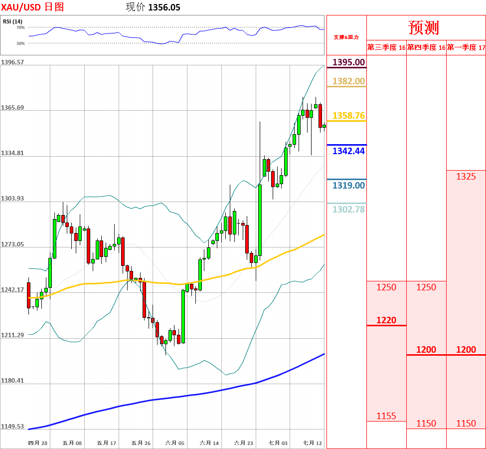 由于美国6月非农数据好转,美元走强,在一定程度上打压金价。昨日,黄金单边下跌,收了上影线长于下影线的中阴线,在没有向下突破1300之前,维持多头思路不变。今日,上方关注1375主要阻力位,下方关注1350主要支撑位。如果向上突破1375,价格将涨至1390附近;但如若下破1350,金价将跌至1335附近。此外,日线动能指标超买之后,拐头向下,但4小时仍旧偏多。