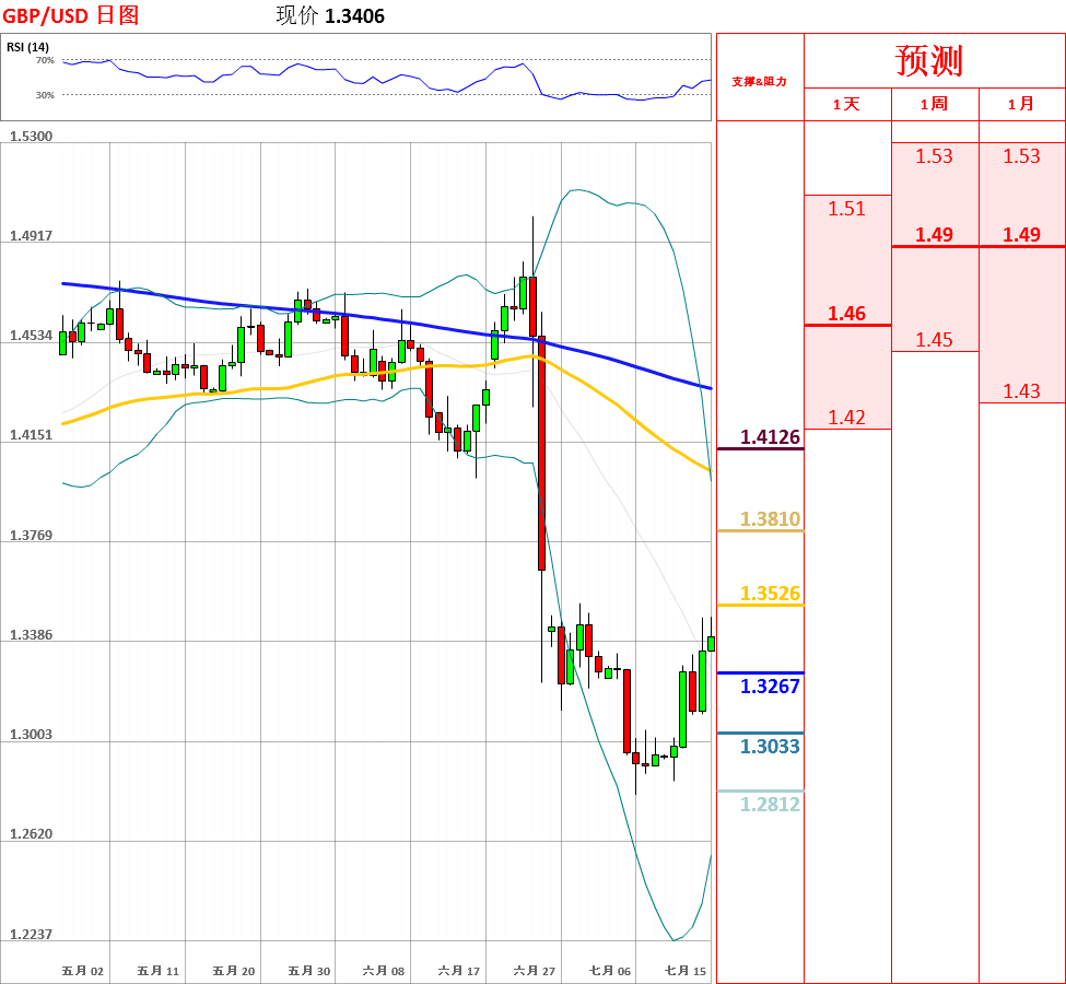 昨日,英国央行决定维持基准利率在0.5%不变,但暗示8月将会降息,英镑兑美元反弹至布林带中轨之后,小幅回落,收了带有上影线的中阳线。自Theresa May确认为英国新首相之后,英国政治风险下降,提振英镑,因此短期内汇率存在继续反弹的可能性。今日,上方关注布林带中轨和20日均线阻力位,下方关注5日均线支撑位。此外,日线、4小时动能指标偏多,预测今日将再次收阳。