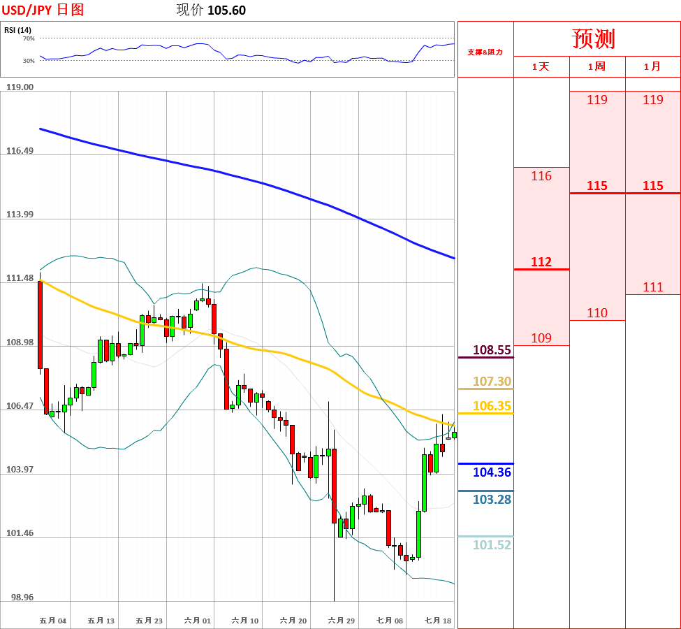 周五,美元兑日元反弹至55日均线之后,遇阻回落,收了带有上影线的小阴线,周线收了带有上影线的大阳线,上周日元贬值了4.34%。目前,日线动能指标开始超买,4小时偏空,预测今日收阴的概率较大,上方关注55日均线主要阻力位下方关注布林带中轨主要支撑位。但是,由于市场预期日本央行将进一步扩大宽松货币政策,因此不排除向上突破55日均线的可能性。