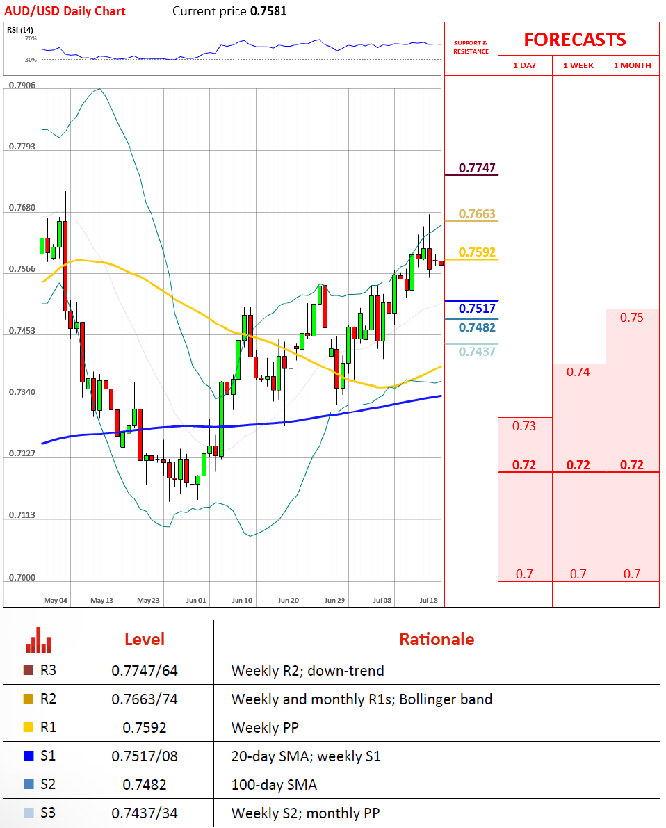 上周五澳元/美元继续下跌,最后收跌54点。尽管技术指标看涨,汇价开盘仍然站在了周PP至上,下行风险一直高企。今天汇价或一直在高于0.76的区域波动,触及第二支撑位(周S1和20日线)0.7510的几率并不大。不过我们并不能排除上行可能,近两月以来的上行趋势还没有完全破坏。