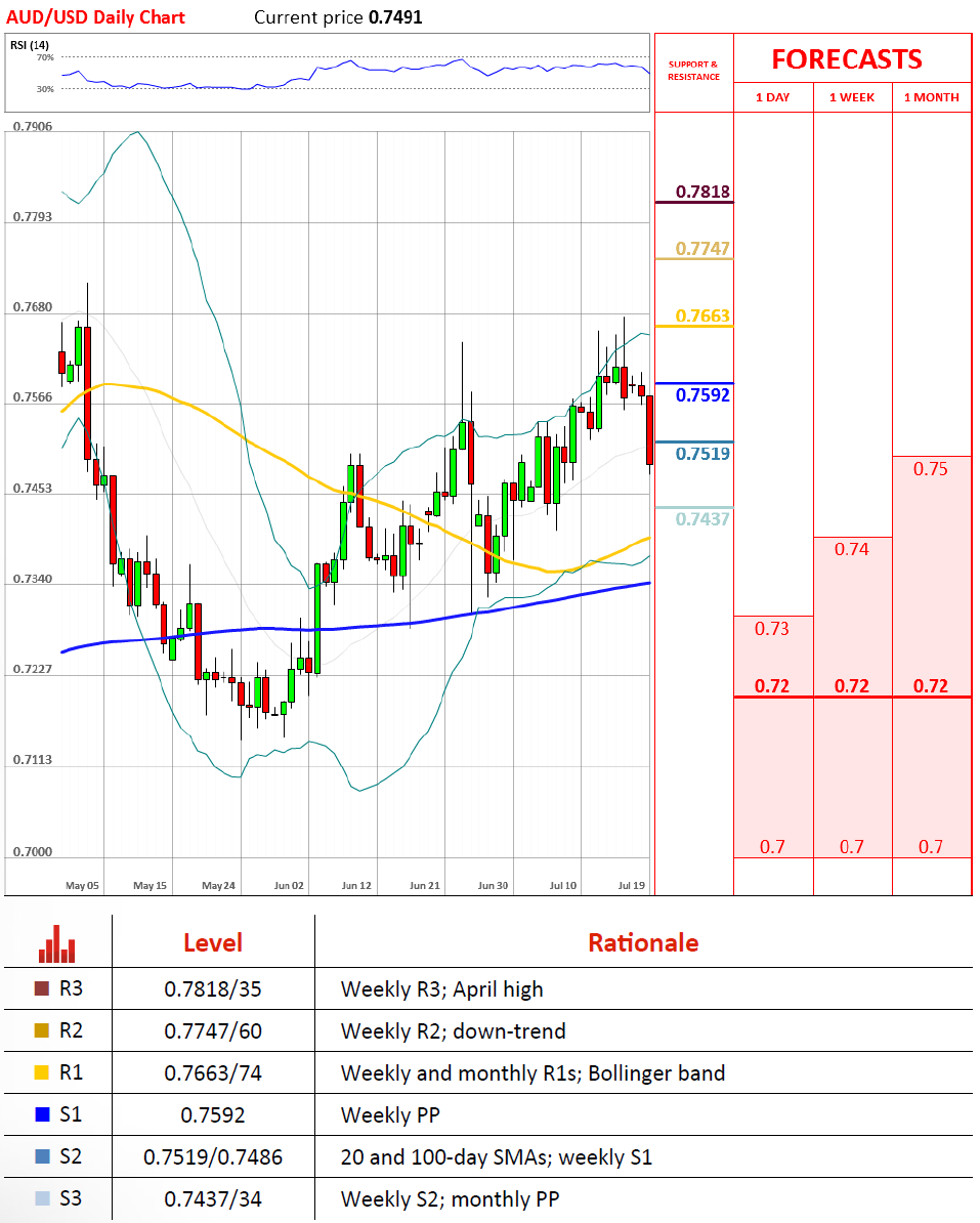澳元/美元周一表现平静,三周上行趋势线仍然完整。不过澳联储会议记录却沉重打击了澳元,宽松预期让澳元大幅下跌。今天之内澳元/美元能够走出低点的可能性并不高,我们更应该关注的是第二支撑(周S1,20/100日线)能否止住跌势。最坏的情况是汇价直线跌向周S2和月PP所在0.7435。不过我们认为汇价可能在今天结束前稳定在0.75。