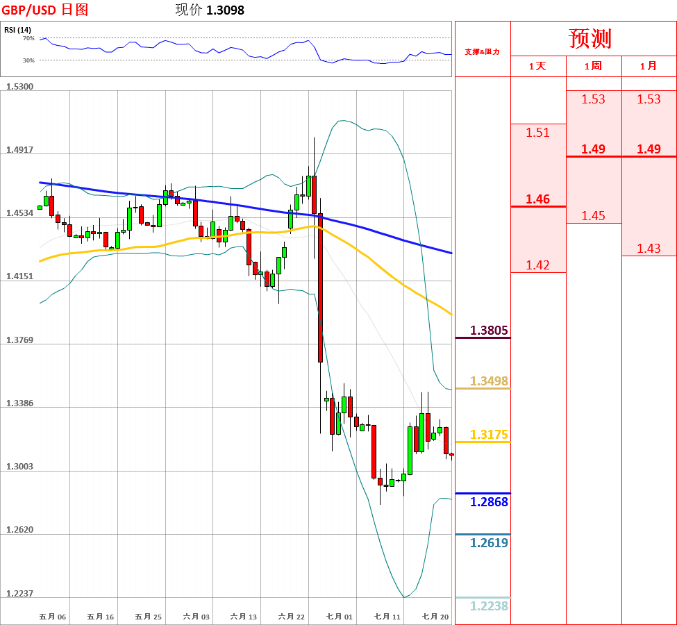 昨日,英镑兑美元单边下跌,收了中阴线,跌幅为1.09%,目前中长期均线呈空头排列,短期均线拐头向下,趋势总体偏空。今日,下方关注1.3000主要支撑位,上方关注5日均线阻力位。如果向下突破1.3000,汇率将逐步测试年内低点1.2797主要支撑位;但如若向上突破5日均线,英镑/美元将反弹至20日均线附近。此外,日线动能指标拐头向下,但周线超卖,因此不排除区间震荡的可能性。今日公布英国6月失业率和6月失业金申请人数。