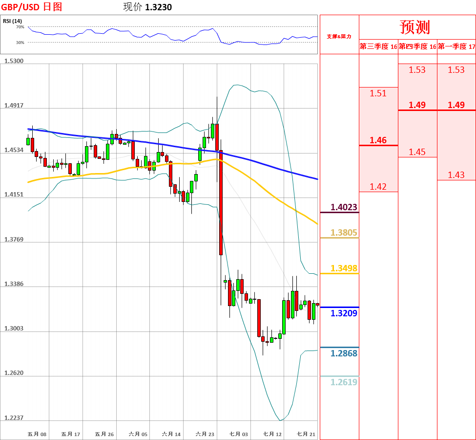 昨日,英镑兑美元跌至前日低点附近之后,震荡上行,收了下影线长于上影线的阳线。目前,中长期均线呈空头排列,价格徘徊在布林带中轨下方,趋势总体偏空。今日,上方关注布林带中轨阻力位,下方关注昨日低点1.3131支撑位。如果向上突破布林带中轨,汇率将测试1.3500主要阻力位;但如若下破昨日低点,英镑/美元将下探至1.3000附近。此外,日线动能指标迷失方向,但4小时超买后拐头向下。今日公布英国6月季调后零售销售月率。