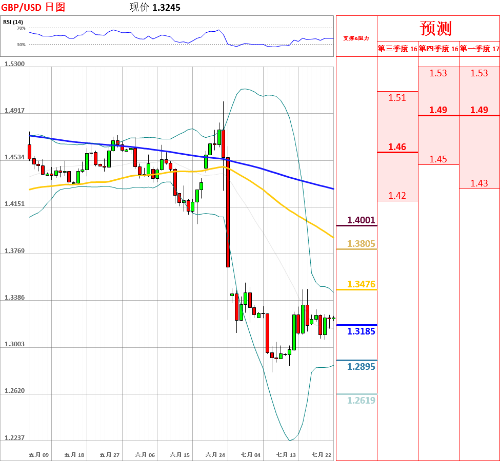 昨日,英镑兑美元窄幅震荡于1.3156至1.3275之间,收了带有上下影线的小阳线。目前,中长期均线呈空头排列,趋势总体偏空;但短期均线粘合,偏向于区间震荡。今日,上方关注1.3314阻力位,下方关注昨日低点1.3156支撑位。如果上破1.3314,汇率将再次测试布林带中轨主要阻力位;但如若下破昨日低点,英镑/美元将下探至1.3100和1.3000之间。此外,周线、日线、4小时动能指标均发出反弹信号。