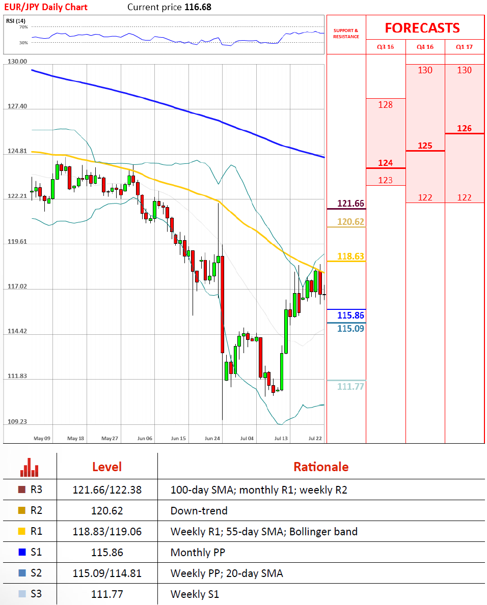 和预期一样,欧元/日元周四收跌,不过并没有来得及测试第一支撑,不论如何,这一下跌也只是强化了货币对当前趋势。虽然缺乏刺激,该货币对却并没有离开趋势通道,该通道下至月PP和下方边界,上至周R1,55日线和布林线。欧元可能继续跌向117.00,而货币对日内也可能继续走高。基本观点是汇价或收于117.55。