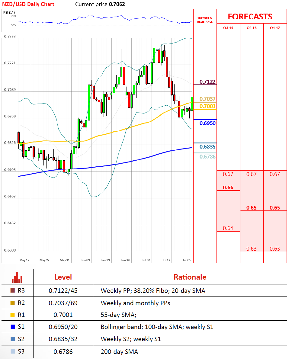 周一,纽元/美元波动幅度加大。不过开/收盘汇价变化并不大,分别为0.7001和0.6998。周二早盘,货币对在55日线活得足够支撑后上行。自0.6997开盘后走高,在11:15 GMT时间落在0.7064。