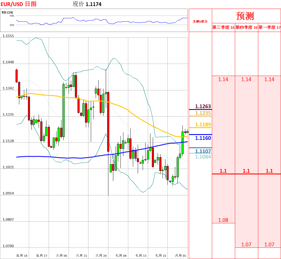 周五,欧元区CPI好于预期,GDP增长率减速,但美国第二季度GDP大幅不及预期,欧元兑美元一度向上突破55日均线和布林带上轨,涨幅为0.93%,收了带有上影线的大阳线,周线收了大阳线。目前,汇率站上200日均线,短期均线拐头向上,日线形成双底反转形态,走势由空转多。今日,上方关注布林带上轨阻力位,下方关注55日均线和双底颈线1.1124支撑位。如果向上突破布林带上轨,汇率将会测试100日均线主要阻力位;但如若下破双底颈线,欧元美元将会跌至布林带中轨附近。目前,日线、4小时动能指标超买,而且4小时MACD出现顶背离,因此今日回调的可能性较大。今日公布欧元区7月制造业PMI终值。
