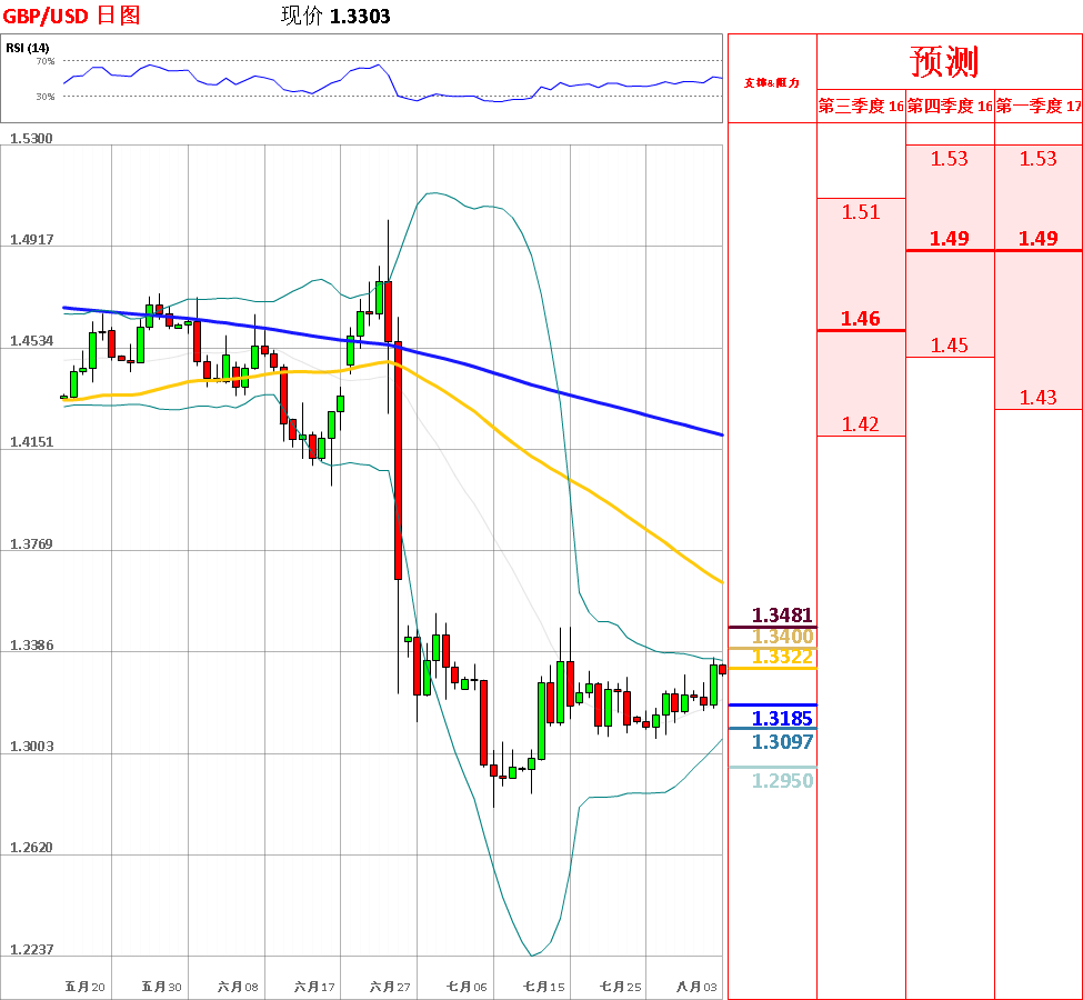 昨日,美元大幅走弱,英镑兑美元单边上涨,一度向上突破短期均线、布林带中轨和下降三角形。目前,短期均线呈多头排列,汇率存在继续反弹的可能性,但中长期趋势仍旧偏空。今日,上方关注1.3400阻力位,下方关注布林带中轨主要支撑位。如果向上突破1.3400,汇率将会测试前期高点1.3480主要阻力位;但如若跌破布林带中轨,英镑/美元将再次回归三角形中。此外,虽然日线动能指标偏多,但4小时超买后拐头向下,因此不排除下跌的可能性。今日公布英国7月服务业PMI。