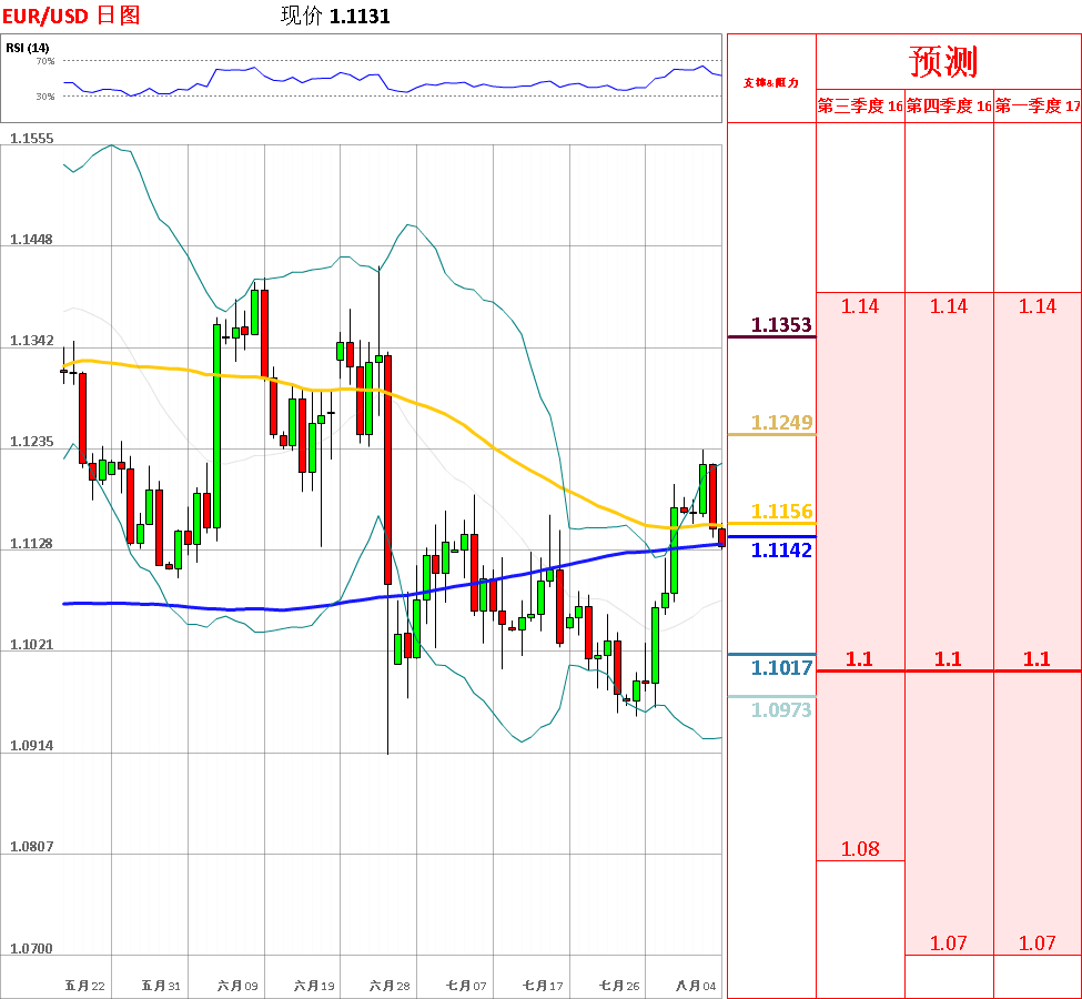 昨日,受到ADP小非农数据的影响,美元强势反弹,欧元兑美元反弹至100日均线后大幅回落,一度向下突破前日低点和55日均线,收了中阴线,跌幅为0.66%。目前,虽然短期均线呈多头排列,但日线动能指标有继续回调的迹象。今日,上方关注55日和5日均线阻力位,下方关注布林带中轨主要支撑位。如果向上突破5日均线,汇率将再次测试100日均线主要阻力位;但如若跌破布林带中轨,欧元/美元将会跌至200日均线附近。