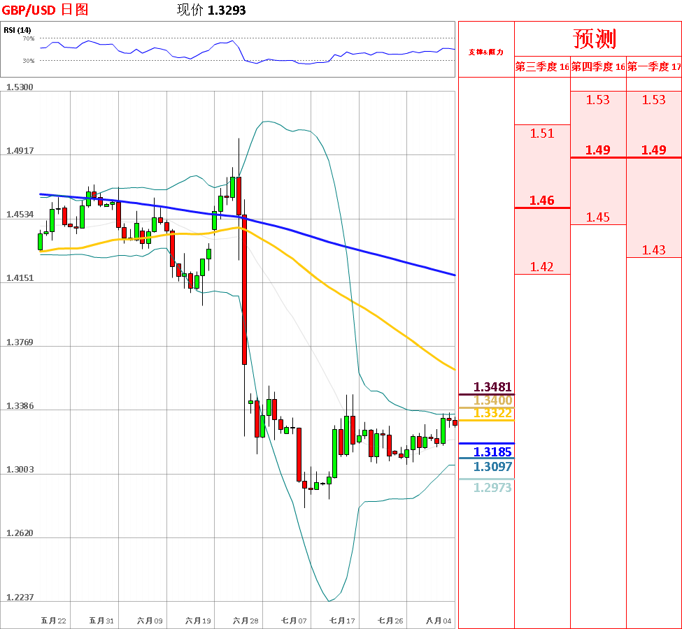 昨日,英镑兑美元窄幅震荡于1.3280至1.3371之间,收了下影线长于上影线的小阴线。目前,虽然中长期趋势仍旧偏空,但短期均线呈多头排列,汇率徘徊在布林带中轨上方,因此短期内存在继续反弹的可能性。今日,上方关注1.3400阻力位,下方关注布林带中轨主要支撑位。如果向上突破1.3400,汇率将逐步反弹至布林带上轨附近;但如若跌破布林带中轨,英镑/美元可能会再次回到前期下降三角形内。此外,4小时动能指标再次拐头向上,但日线Stochastic、CCI开始超买。今日英国央行公布利率决定、会议纪要及季度通胀报告。