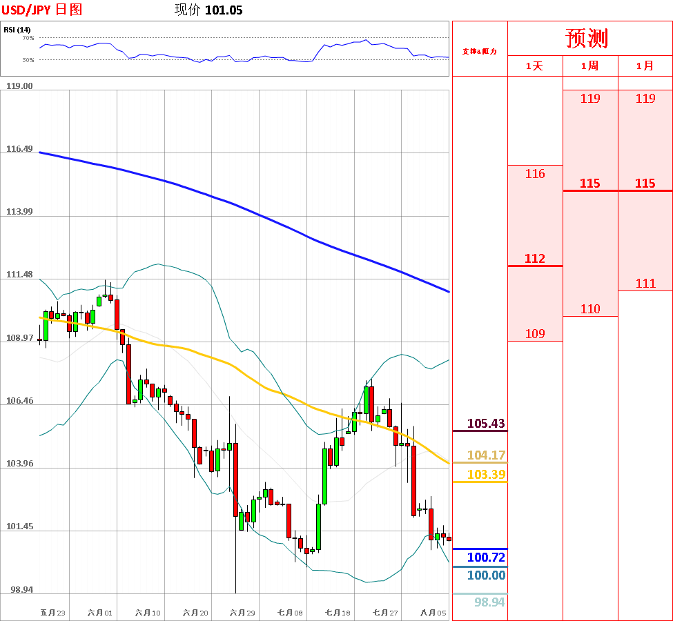 昨日,美元兑日元窄幅震荡于100.86至101.67之间,收了十字星线。目前,短中长期均线呈空头排列,趋势完全偏空,但日线动能指标超卖后拐头向上,因此不排除震荡反弹的可能性。今日,上方关注102阻力位,下方关注8月1日低点100.68支撑位。如果向上突破102,汇率将逐步反弹至布林带中轨附近;但如若跌破100.68,美元/日元将向下突破100中长期主要支撑位。
