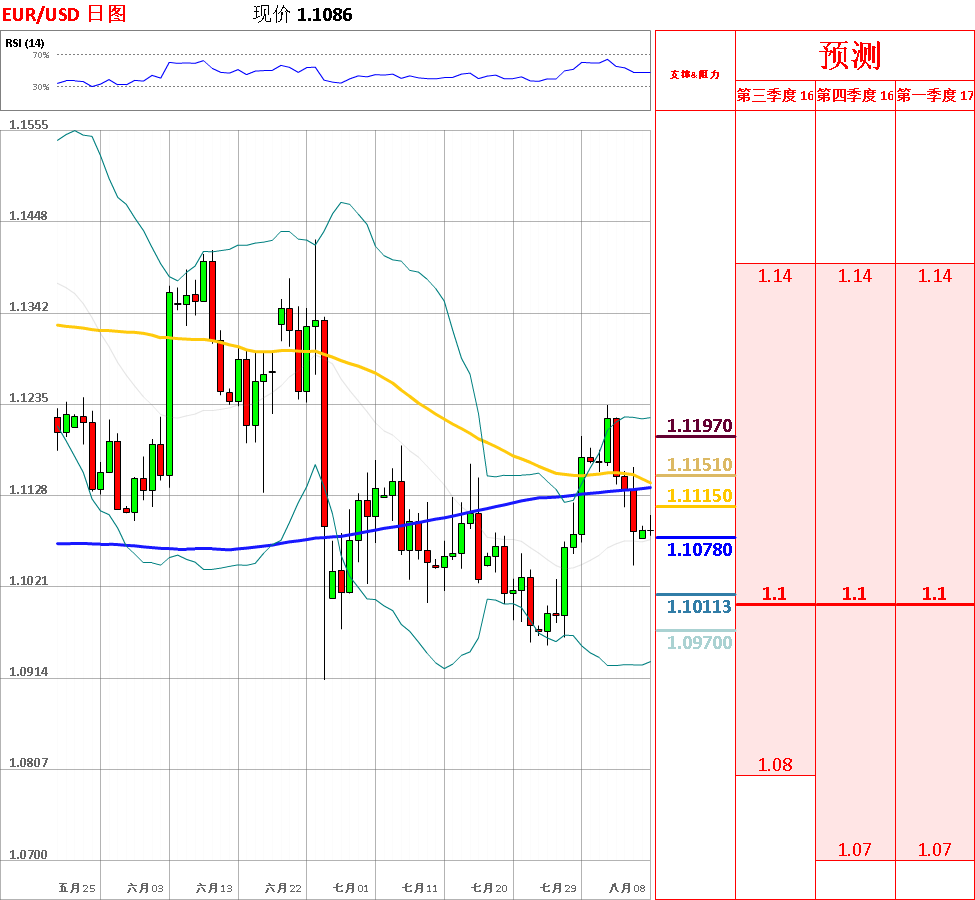 周五,受到美国7月非农的影响,欧元兑美元反弹至55日均线之后,一度向下突破布林带中轨和200日均线,收了带有上下影线的中阴线,周线收了小阴线。目前,汇率再次回归200日均线附近,100日均线拐头向下,短期走势由多转空,中期趋势偏震荡。今日,上方关注布林带中轨和10日均线阻力位,下方关注200日均线支撑位。如果突破10日均线,汇率将逐步反弹至55日均线附近;但如若跌破200日均线,欧元/美元将测试周五低点1.1046支撑位。此外,日线动能指标偏空,但4小时超卖后拐头向上。今日公布欧元区8月Sentix投资者信心指数。