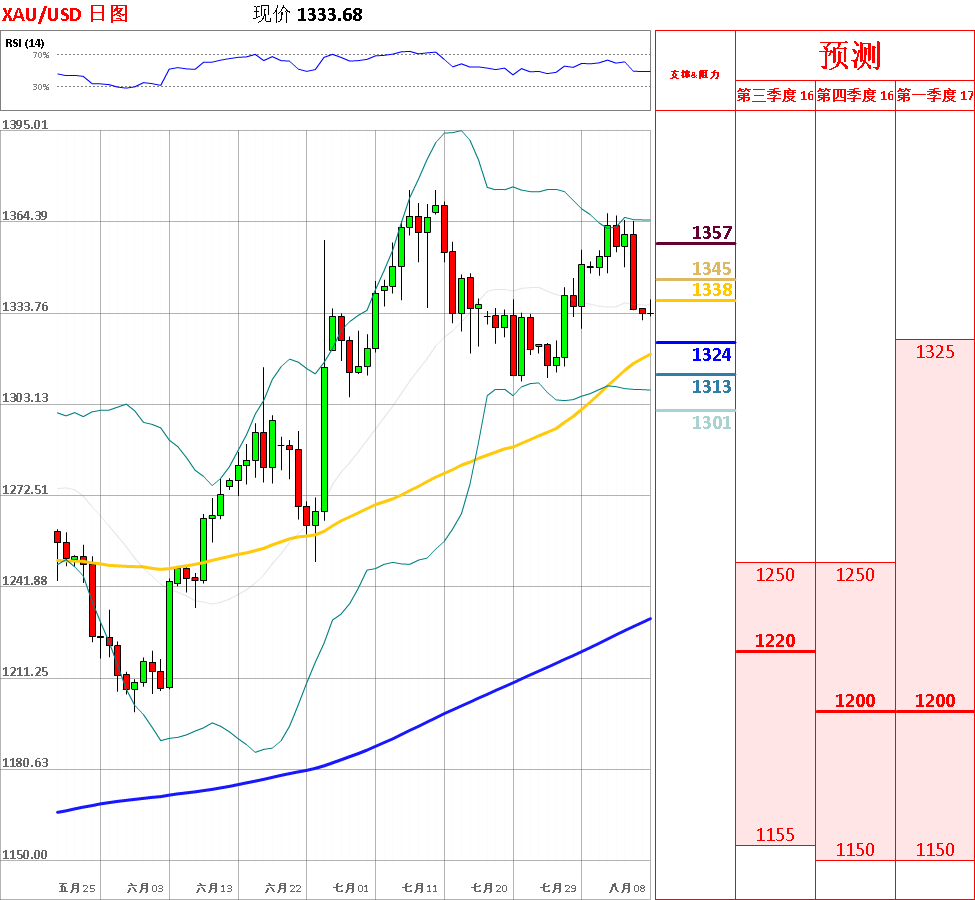 周五,美国7月非农远超预期,6月非农数据被上调,美元大幅反弹,黄金涨至1365之后,一度向下突破短期均线和布林带中轨,收了带有上影线的光脚大阴线,跌幅为1.84%,周线收了带有长上影线的小阴线。目前,虽然中长期趋势偏多,但日线有形成双顶反转形态的迹象,颈线为1320,而且日线、周线动能指标转空。今日,上方关注短期均线阻力位,下方关注1328.46支撑位。如果向上突破短期均线,双顶反转形态被打破;但如若跌破1328.46,黄金将会测试1320主要支撑位。今日公布美国7月就业市场状况指数(LMCI)。