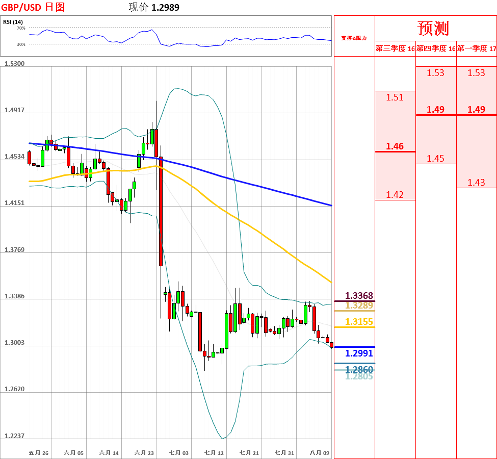 昨日,英镑兑美元震荡下跌,一度向下突破上升三角形并且站稳,收了小阴线。目前短中长期均线形成空头排列,走势由震荡转空。今日,上方关注三角形下沿1.3064主要支撑位,下方关注1.2900主要支撑位。如果向上突破1.3064,汇率将再次横盘整理;但如若跌破1.2900,英镑/美元在接下来几个交易日将逐步测试年内低点的支撑。此外,日线动能指标偏空,但Stochastic和CCI超卖,4小时MACD出现底背离,因此不排除震荡反弹的可能性。今日公布英国6月工业产出月率、6月制造业产出月率和6月季调后商品贸易帐。