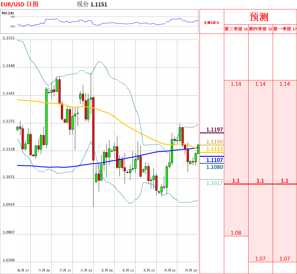 昨日,欧元兑美元向下突破200日均线后触底反弹,一度突破布林带中轨和短期均线,收了下影线长于上影线的阳线,汇率在近期徘徊于100日和200日均线之间,走势总体偏震荡。今日亚盘时分,欧元/美元一度向上突破10日和55日均线,短期均线拐头向上,短期走势由空转多,上方关注7月31日高点1.1184阻力位,下方关注10日均线支撑位。如果上破1.1184,汇率将测试1.1200阻力位;但如若跌破10日均线,欧元/美元将跌至布林带中轨附近。此外,日线、4小时动能指标偏多,因此存在继续上攻的可能性。