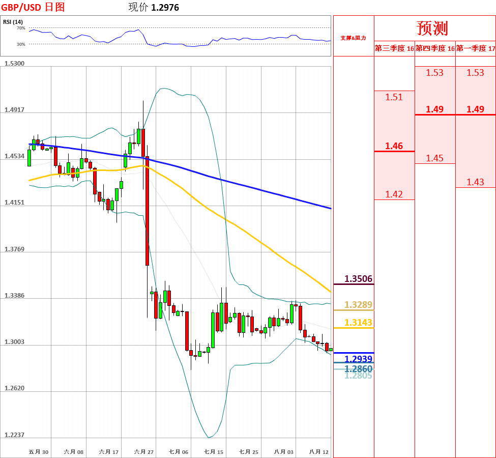 昨日,英镑兑美元反弹至5日均线后遇阻回落,收了带有上下影线的阴线;目前,短中长期均线呈空头排列,趋势总体偏空。但是,日线Stochastic和CCI超卖,而且4小时MACD出现底背离,因此不排除短期震荡反弹的可能性。今日,上方关注昨日高点1.3028阻力位,下方关注前期低点1.2876主要支撑位。如果向上突破昨日高点,汇率将反弹至10日均线附近;但如若跌破2.2876,英镑/美元将有望再次创下历史新低。