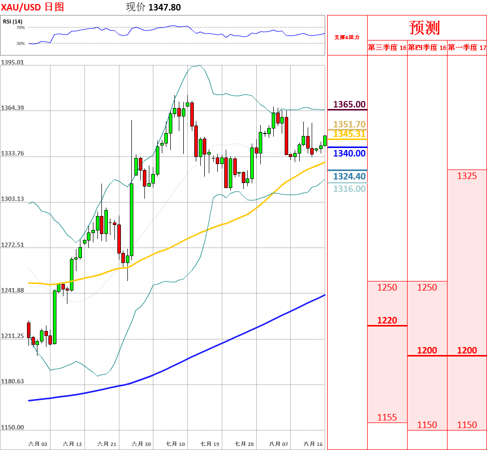 昨日,黄金窄幅震荡于1335.75至1343.81之间,收了十字星线。目前,中长期均线呈多头排列,短期均线粘合,日线、4小时动能指标迷失方向,因此短期内存在继续区间震荡的可能性,区间为1330至1360。今日,上方关注1350阻力位,下方关注布林带中轨支撑位。如果向上突破1350,价格将测试1360短期主要阻力位;但如若跌破布林带中轨,黄金将试探震荡区域下沿1330的支撑。今日公布美国7月季调后CPI和7月工业产出率。