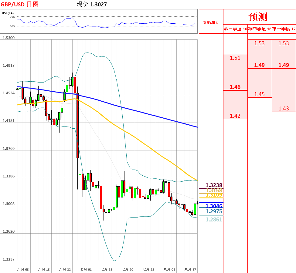 昨日,英镑兑美元开盘后震荡反弹,一度向上突破5日、10日均线,收了光脚大阳线,涨幅为1.30%。目前,短中长期均线呈空头排列,趋势仍旧偏空。此外,日线动能指标偏多,但4小时超买后拐头向下,1小时出现顶背离,因此不排除技术性反弹后继续空头趋势的可能性。今日,上方关注布林带中轨主要阻力位,下方关注5日、10日均线支撑位。如果向上突破布林带中轨,汇率将反弹至1.3200附近;但如若跌破5日均线,走势将再次转空。今日公布英国7月失业率和7月失业金申请人数。