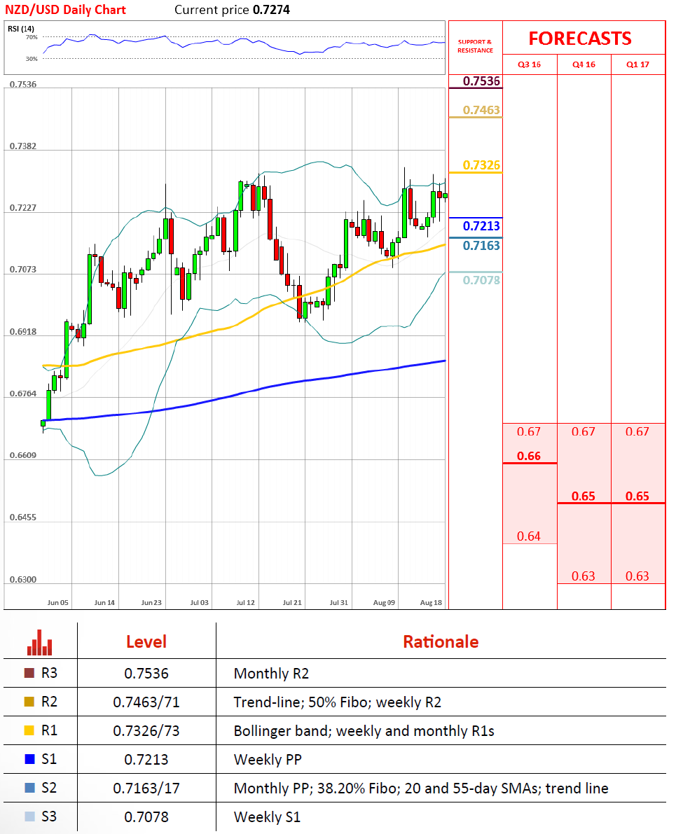 周四,纽元/美元价格飙高,受FOMC方面温和态度的影响,汇价一路冲高。不过FOMC会议记录并不是逆转行情,早些时候货币对已经在周PP0.7212开始反弹上行。目前来看,汇价有望冲击0.7337,即周R1所在之处。日技术指标目前给出的也是这一预测。