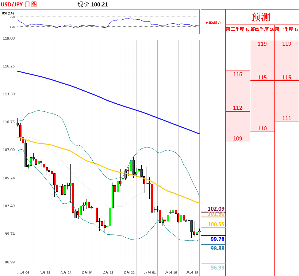 昨日,美元兑日元窄幅震荡于99.64至100.50之间,收了带有上下影线的小阴线,首次收盘于100下方。目前,短中长期均线呈空头排列,周线动能指标偏空,趋势偏空;但是,日线MACD出现底背离,4小时动能指标拐头向上,因此不排除短期技术性反弹的可能性。今日,上方关注100.83主要阻力位,下方关注昨日低点99.64支撑位。如果向上突破100.83,汇率将会测试10日阻力位;但如若跌破昨日低点,美元/日元将会测试近两年低点98.95。
