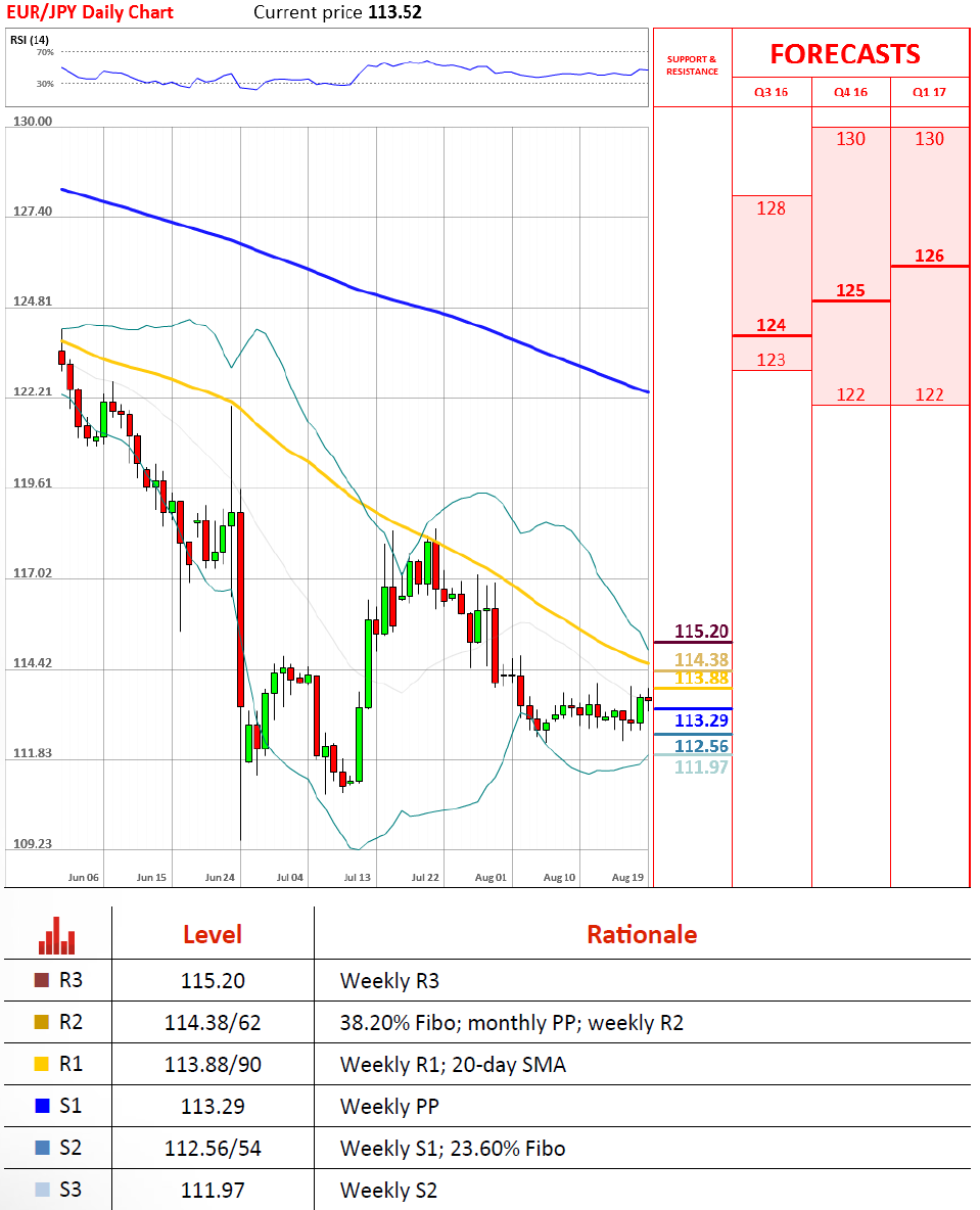 欧元/日元周四冲高,不过汇价仍然没有突破113.65。因此这一整理趋势或还在继续。货币对昨天没能进一步走跌,而技术指标来看,今天跌势或将继续。周PP目前在113.29,但113仍然是关键支撑。而下行波动甚至可能触及周S1和23.6%斐波所在112.55。基本预测是汇价还是会在113.15波动。