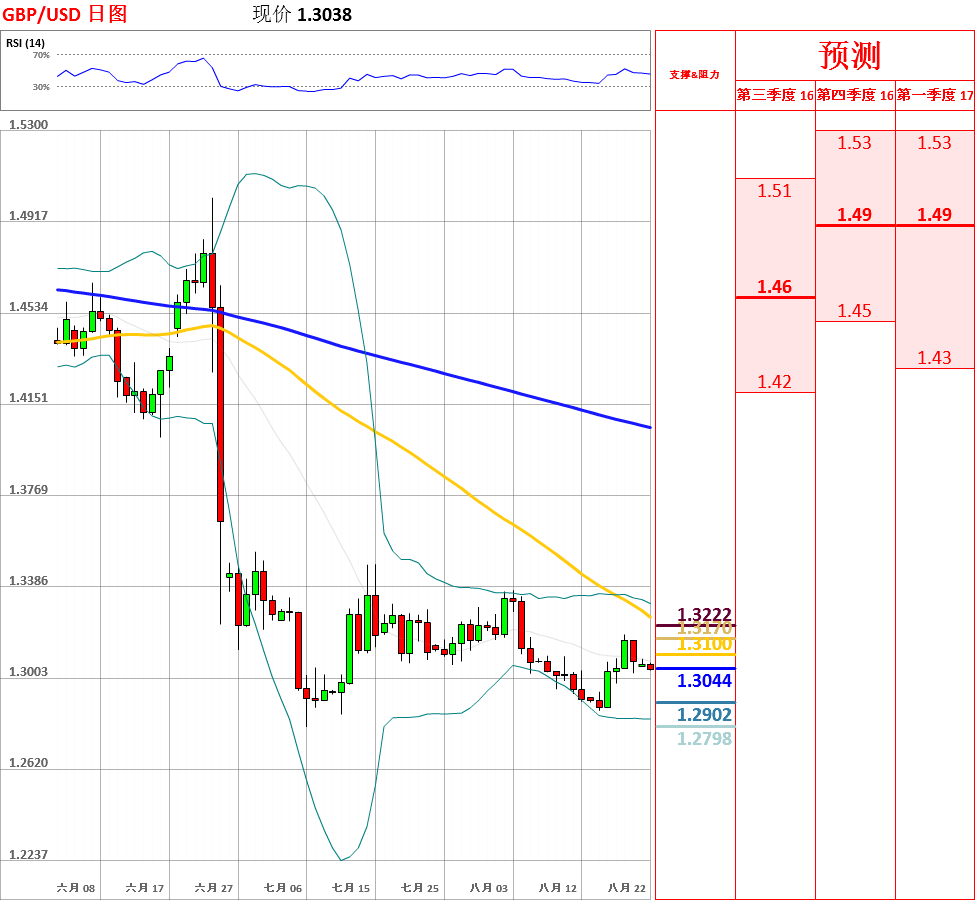 周五,英镑兑美元震荡下行,收了带有上下影线的阴线,周线收了带有上下影线的阳线。目前,中长期均线呈空头排列,短期均线粘合,因此不排除区间震荡的可能性。今日,上方关注布林带中轨阻力位,下方关注10日均线支撑位。如果向上突破布林带中轨,汇率将会测试上周高点1.3185;但如若跌破10日均线,英镑/美元将会试探前期低点1.2979支撑位。此外,日线动能指标开始转空,4小时MACD出现顶背离后快线和慢线形成死叉,因此今日收阴的可能性较大。