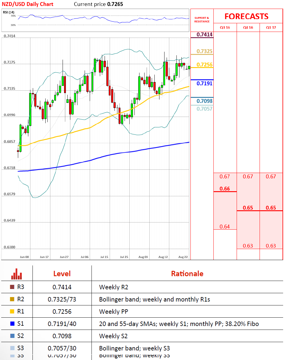 周一纽元兑美元开盘跳空,汇价较上周收盘价大幅下跌。今天的开盘价落在0.7255,已经低于周PP 0.7256。由于汇价低开,下方在20日线0.7191之前已经没有其他支撑位。20日线下方的第一支撑即周S1 0.7188,这意味着此处行情或出现小幅转机。