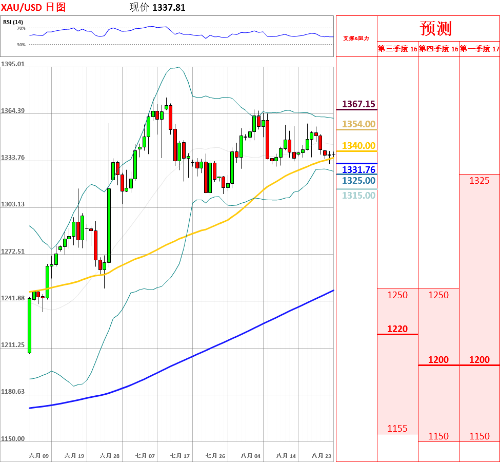 昨日,黄金回调至1330之后,遇到较强的支撑并且反弹,收了带有长下影线的小阴线。目前,中长期多头趋势保持完好,但短期均线粘合,价格在最近震荡于1330至1360之间。今日,上方关注布林带中轨和短期均线阻力位,下方关注1330短期主要支撑位。如果向上突破短期均线,金价将会测试1350和1360主要阻力位;但如若跌破1330,黄金将会跌破55日均线。此外,日线、4小时动能指标发出不同信号,因此不排除继续区间震荡的可能性。
