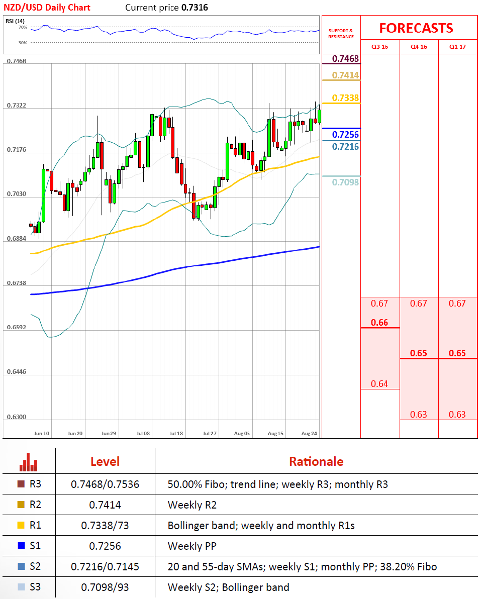 正如之前预计的情况,纽元/美元上行突破至阻力位周R1(0.7347)。周三早上下跌继续,汇价抵达周PP 0.7256,不过最后是在0.7269处改变方向,再次上涨并触及之前所提阻力。这几个位置都十分强力,因此汇价可能一直波动,直到布林线开始上行以及20日线也开始转向。