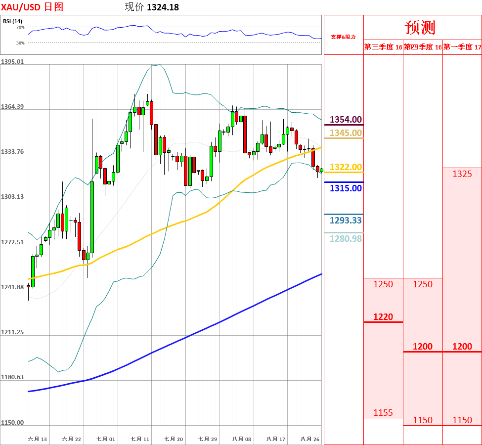 昨日,黄金反弹至55日均线后遇阻回落,一度向下突破1320,收了带有上下影线的小阴线;目前,虽然中期趋势偏多,但短期均线呈空头排列,因此存在继续回调的动能。今日,上方关注55日均线主要阻力位,下方关注1310主要支撑位。如果向上突破55日均线,金价将升至布林带中轨附近;但如若跌破1310,黄金将会向下突破1300多空分水岭。此外,日线动能指标超卖后拐头向下,4小时动能指标偏多,因此不排除反弹的可能性。今日关注美国第二季度实际GDP修正值和美联储主席耶伦的讲话。