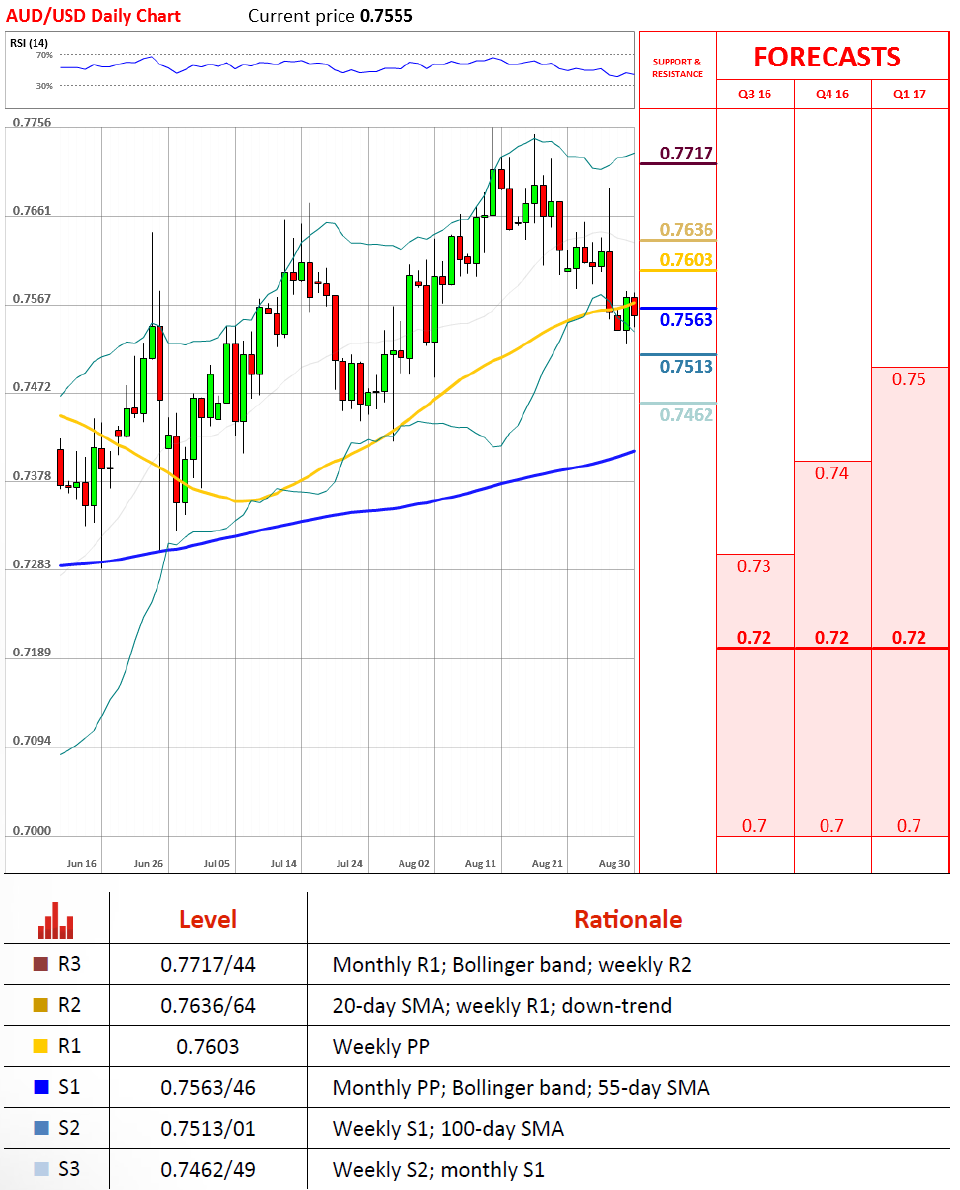 尽管昨天下行波动剧烈,但在即时支撑位的动力成功推高货币对。不过这以支撑位今天却又被破风险,技术指标暗示澳元可能再次下跌。如果下跌出现,则下一目标见周S1和100日线所在0.7508。这一支撑同样重要,如果告破则意味着0.74将面对挑战。
