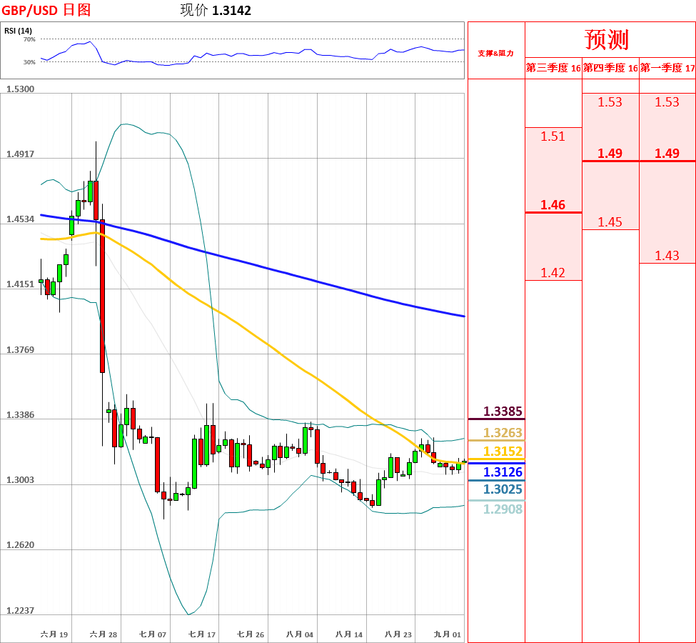 昨日,英镑兑美元回调至1.3060附近后,遇到支撑并且反弹,收了阳线,月线收了带有上下影线的小阴线。目前,短期走势以低位震荡为主,而且短期均线粘合,但中长期趋势仍旧偏空。今日,上方关注1.3200阻力位,下方关注1.3060主要支撑位。如果向上突破1.3200,汇率将会测试55日均线主要阻力位;但如若跌破1.3060,英镑/美元将会跌至1.3000附近。此外,日线动能指标拐头向上,因此不排除反弹的可能性。今日公布英国8月制造业PMI。