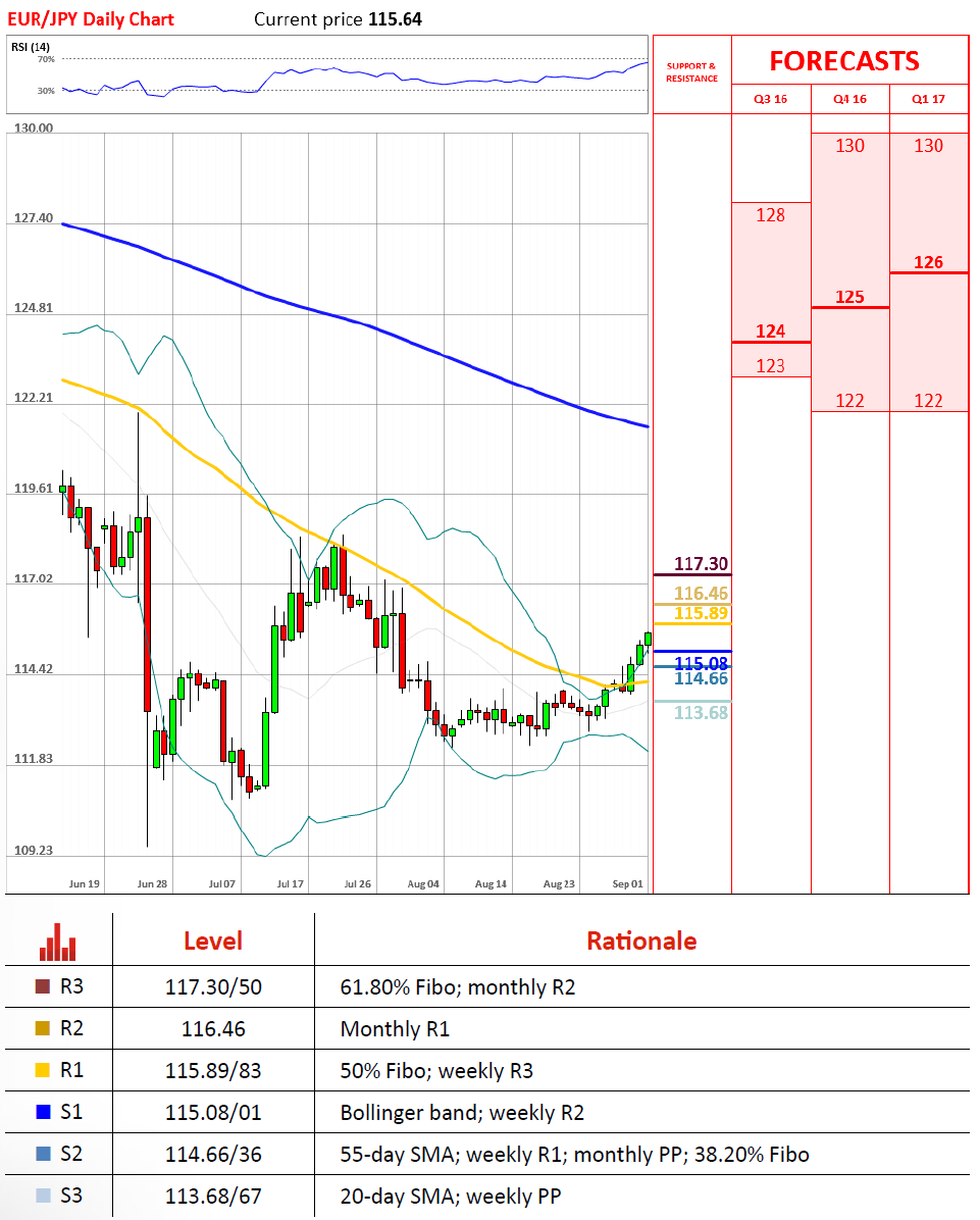 欧元/日元昨天反弹继续,轻易跨过了115大关。今天的行情可能继续上行,在117之前汇价或都不会停下。日图上的指标暗示还会有另一次上行,但周指标却表现犹豫。欧元/日元目前需要面对的阻力见115.85,该位置有50%斐波和周R3,当前涨势可能在这一位置遭遇挫折。