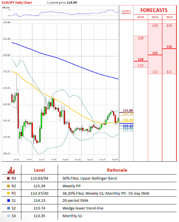 欧元/日元并没有继续向2个月三角模型的底部跌去,而是在114.36/37就开始了反弹。这可能彻底逆转短线去死,115.39(周PP)将成为下一目标;如果该位置告破,则反弹很可能继续冲向三角形顶部的116.03。基于货币对现在所处模型的位置,上行突破的几率很大,汇价可能继续向100日线和周R2进发。