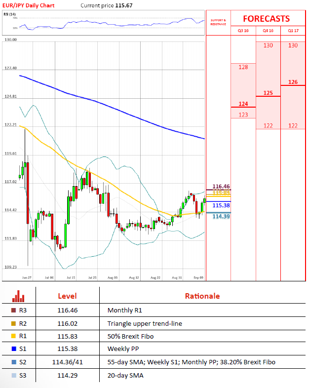 欧元/日元并未跌下114.36/42,该位置毕竟有月PP,周S1,斐波线38.2%(自退欧大跌以来)和55日线构成的支撑。货币对还在冲击周PP 115.3863,目标是斐波线50%。如果收于该位置智商,则意味着两个月以来的三角模型上限 116.02 也将在这波攻势中被考验。