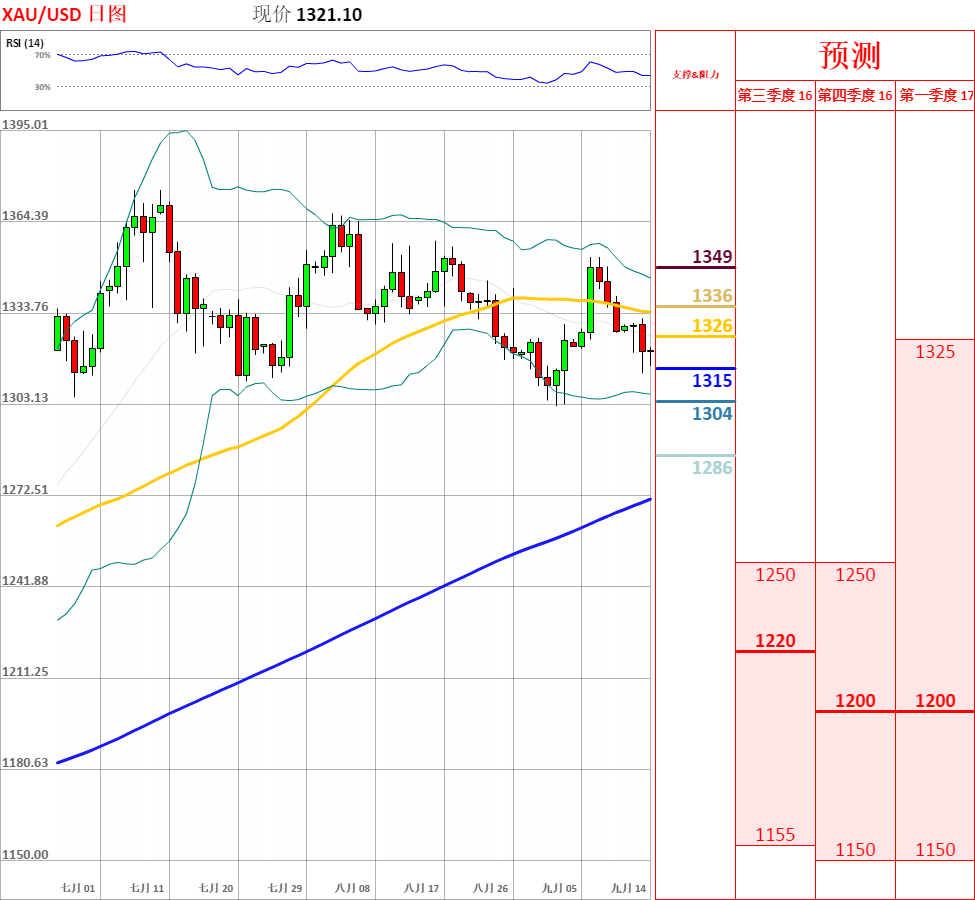 昨日,美元走强,黄金单边下跌,收了带有上下影线的阴线,跌幅为0.7%。近期,价格震荡于1300至1350之间,因为市场在等待美联储9月利率决议或更多信号。今日,上方关注5日均线阻力位,下方关注1310主要支撑位。如果向上突破5日均线,金价将会站上布林带中轨;但如若跌破1310,黄金将会再次测试1300多空分水岭。此外,日线动能指标略微偏空,但4小时动能指标超卖后拐头向上,因此不排除区间真的那个的可能性。