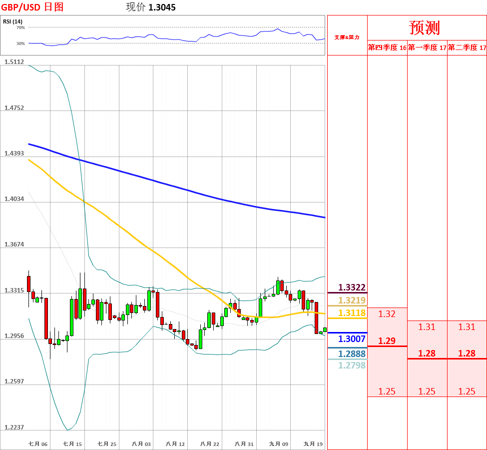 周五,美元走强,英镑兑美元一度向下突破短中期均线和1.3064主要支撑位,收了大阴线,跌幅为1.79%,周线收了带有上影线的中阴线。目前,短期走势以低位宽幅震荡为主,中长期空头趋势保持完好。今日,上方关注1.3064阻力位,下方关注上周低点1.2995支撑位。如果向上突破1.3064,汇率将会测试1.3100的阻力;但如若跌破上周低点,英镑/美元将试探1.2900支撑位。此外,日线动能指标偏空,4小时指标超卖后拐头向上,因此不排除区间震荡的可能性。