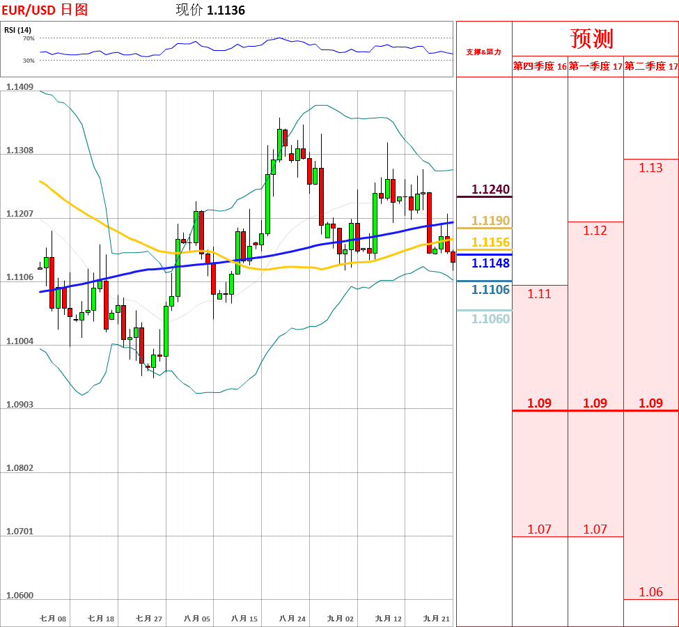 昨日,欧元兑美元反弹至10日均线后大幅回落,收了带有长上影线的阴线。目前,中长期趋势依然以低位区间震荡为主,但短期走势震荡偏空。今日,上方关注5日均线阻力位,下方关注200日均线主要支撑位。如果向上突破5日均线,汇率将会再次测试100日均线和布林带中轨主要阻力位;但如若下破200日均线,欧元/美元将跌至布林带下轨附近。此外,日线动能指标偏空,4小时指标超卖,因此不排除区间震荡的可能性。今日重点关注美联储FOMC利率决定和政策声明及美联储主席耶伦召开新闻发布会。