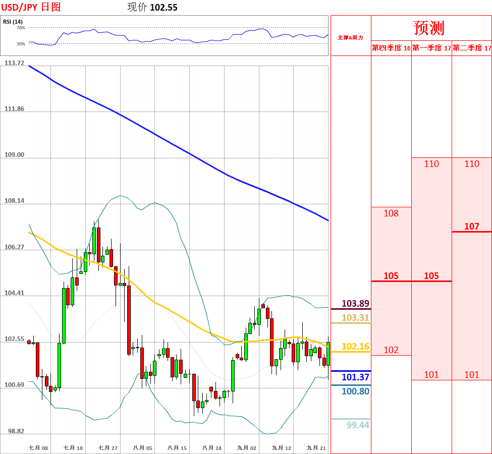 今日,日本央行决定维持政策利率在-0.1%不变,符合市场预期。此外,日央行决定修改政策框架,引入量化质化宽松,附加收益率曲线控制,取消所持日本国债的平均期限目标。消息公布后,美元/日元快速反弹并且突破102阻力位。今日,上方关注103主要阻力位,下方关注短期均线的支撑。如果向上突破103,汇率将测试103.36的阻力;但如若跌破短期均线,美元/日元将再次试探101关口。此外,日线、4小时动能指标开始转多,因此不排除继续反弹的可能性。