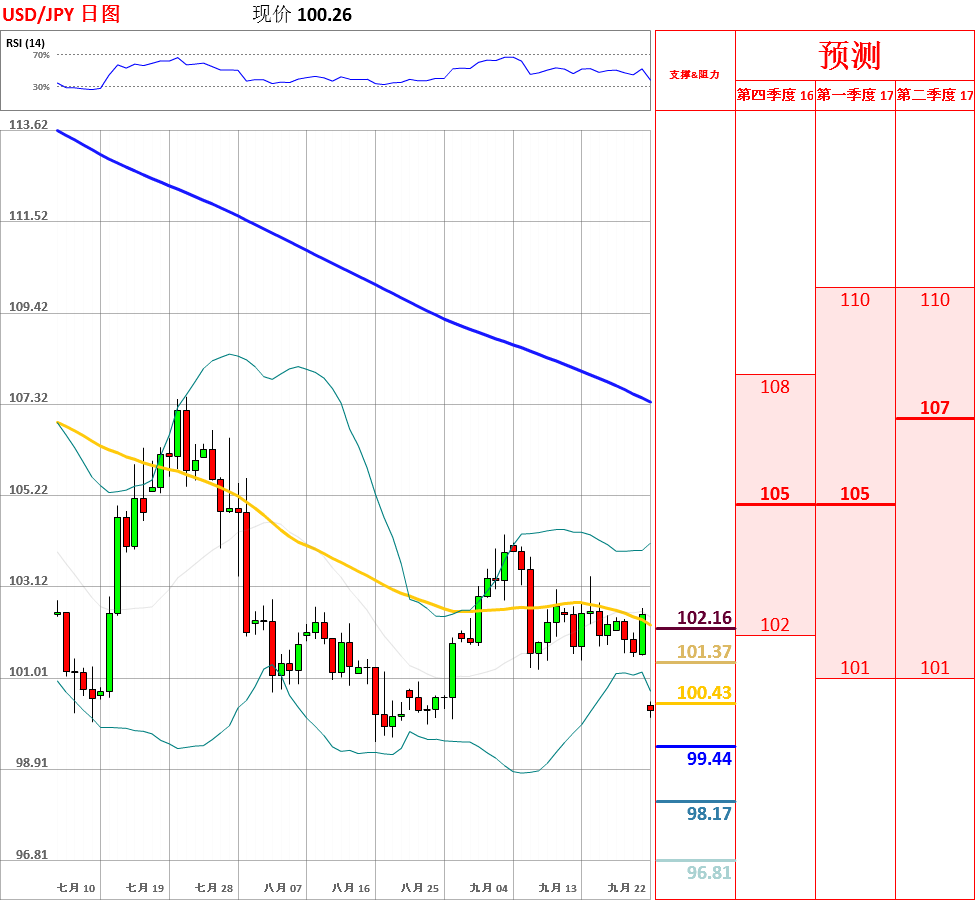 昨日,受到日本央行利率决议的影响,美元兑日元反弹至103附近后大幅回落至100上方,收了带有长上影线的光脚中阴线,跌幅为1.39%。目前,短中长期均线再次形成空头排列,趋势完全偏空;但是,鉴于日线、4小时动能指标超卖,而且现价离5日均线较远,因此不排除震荡反弹的可能性。今日,上方关注101阻力位,下方关注100主要支撑位。如果突破101,汇率将反弹至5日均线上方;但如若跌破100,美元/日元将测试8月低点99.54的支撑。