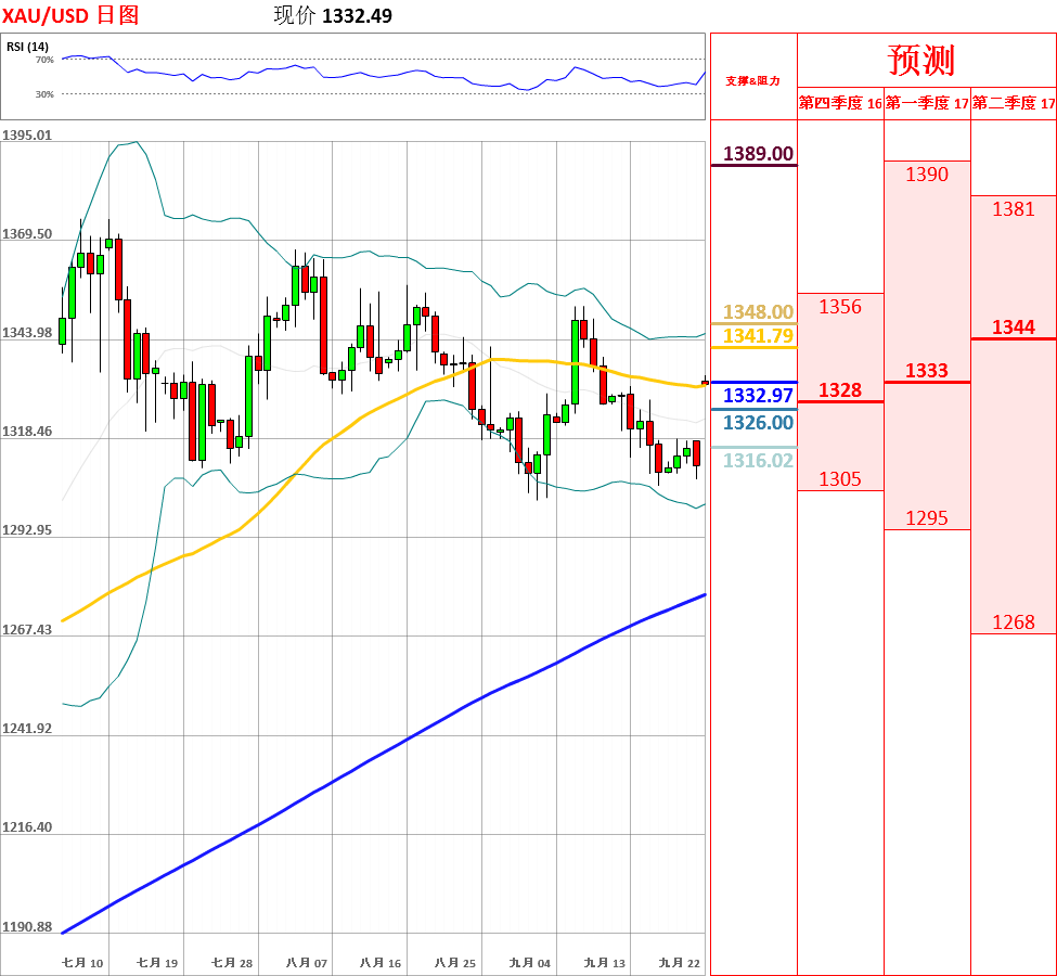 昨日,受到美联储维持利率不变的影响,黄金在100日均线附近止跌反弹,一度向上突破短期均线、布林带中轨和55日均线,收了带有上下影线的大阳线,涨幅为1.1.56%。目前,中期多头趋势仍未改变,短期走势以高位宽幅震荡为主,但开始转多。今日,上方关注1340阻力位,下方关注布林带中轨主要支撑位。如果向上突破1340,价格将测试1352主要阻力位;但如若跌破布林带中轨,黄金将会试探短期均线系统的支撑。此外,日线、4小时动能指标发出不同信号,因此不排除区间震荡的可能性。今日公布美国至9月17日当周初请失业金人数。