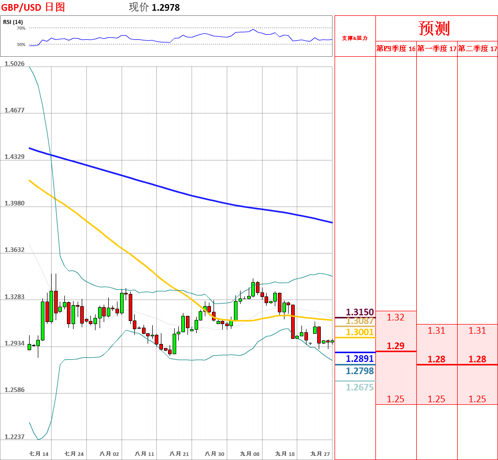 昨日,英镑兑美元窄幅震荡于1.2916至1.2987,收了下影线长于上影线的小阳线。目前,中长期空头趋势保持完好,短期走势以低位宽幅震荡为主,但短中长期均线再次形成空头排列,因此不排除跌破震荡区域的可能性。今日,上方关注5日及10日均线阻力位,下方关注上周五低点1.2914支撑位。如果向上突破10日均线,汇率将测试布林带中轨主要阻力位;但如若跌破1.2914,英镑/美元将会试探震荡区域下沿1.2865主要支撑位。今日公布英国9月CBI零售销售差值。
