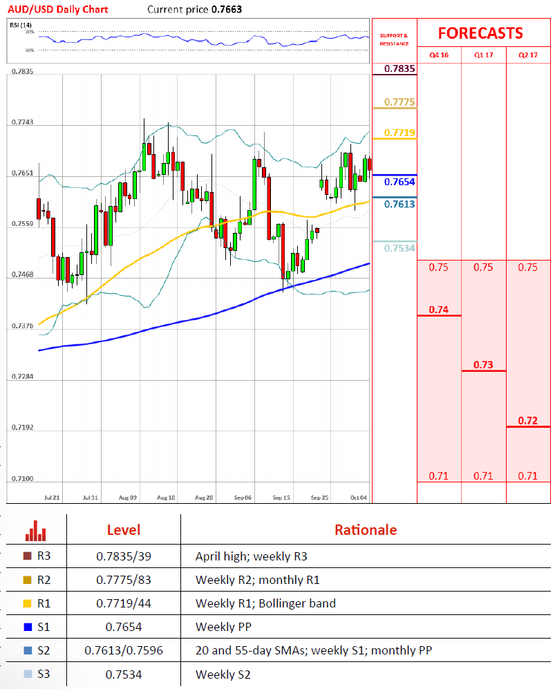 澳元/美元周一继续上涨,但却连0.77都很难触及。虽然技术指标继续看多澳元,但下行风险仍然存在。周PP仍然是最近支撑,而更强力的支撑则是有月PP,周S1,20和55线把守的0.76。0.77则是最近的阻力位置,只有拿下这一位置才能确定澳元之后的涨势。
