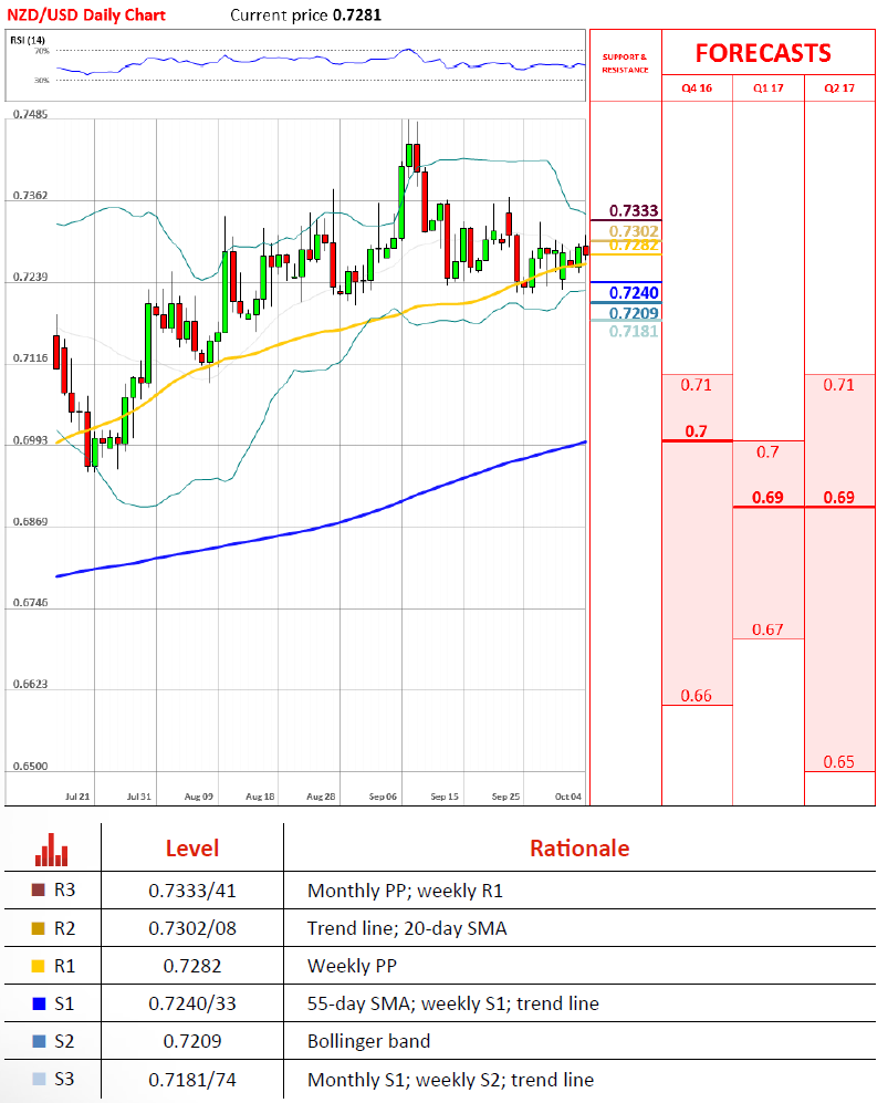 纽元周二盘中行情平静,汇价仍然在周PP 0.7282附近上下波动。周一行情波动相似,也是围绕周PP活动。不过有个最大的不同,周二盘中汇价波动方向更多想说而不是像周一时候向下。目前日技术指标表示看跌。