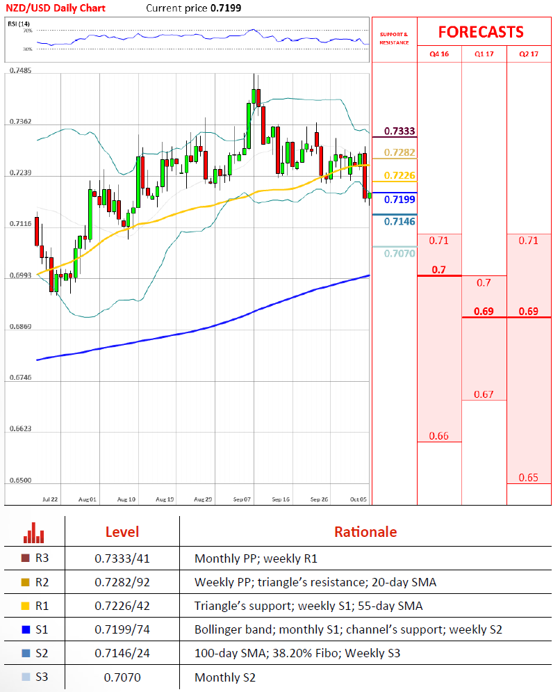 周三,纽元/美元连续第三日下跌,目前已经跌落0.72大关,也就是7周以来低点。不过自0.7181开始到0.7174则是一个强势支撑区域,该区域有月S1,周S2和通道下轨,该上行通道起始于1月。且此时汇价也刚刚从一个下行三角模型中悄悄退出。