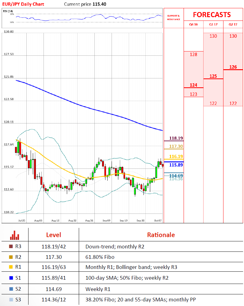 正如预期那样,欧元/日元周四行情相对平稳,未能通过116.00。数个阻力位聚集这一区域使得欧元难以突破,或进入下行,尽管技术指标暗示会有反弹出现。100日线和50%斐波齐聚115.85,但能提供的支撑有限。因此下方的周R2(115.41)才是主要目标。另外欧元/日元已经平走一周,似乎已经是纠正出现的时机。