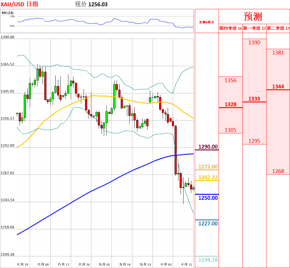 昨日,受到美联储官员发出鹰派言论的影响,美元大幅走强,黄金震荡下跌,收了带有上影线的光脚阴线。目前,短期均线呈空头排列,走势偏空,但日线动能指标超卖后拐头向上,因此不排除震荡反弹的可能性。今日,上方关注200日均线主要阻力位,下方关注昨日低点1251.23支撑位。如果向上突破200日均线,金价将会测试1265和1270阻力位;但如若跌破昨日低点,黄金将试探上周低点1241.39的支撑。今日关注纽约联储主席杜德利发表讲话和美联储FOMC公布9月货币政策会议纪要。